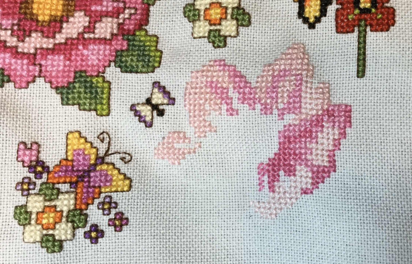I stitched for a few hours tonight (after finishing our puzzle). I continued working on the light pink flower.
