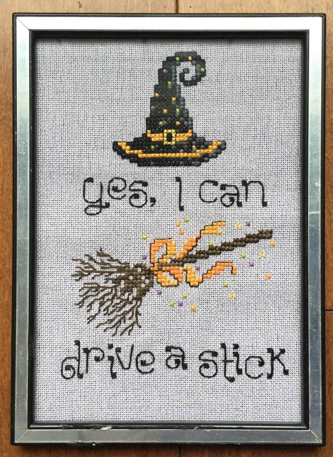 The second framed project is by Sue Hillis called Yes, I Can Drive A Stick. I don’t usually stitch Halloween pictures, but this one I had to do because I actually prefer to drive standard transmission (cars with a stick). So this project is perfect for me, and I stitched it on purple. The frame is a little banged up, but I reused it from our house.