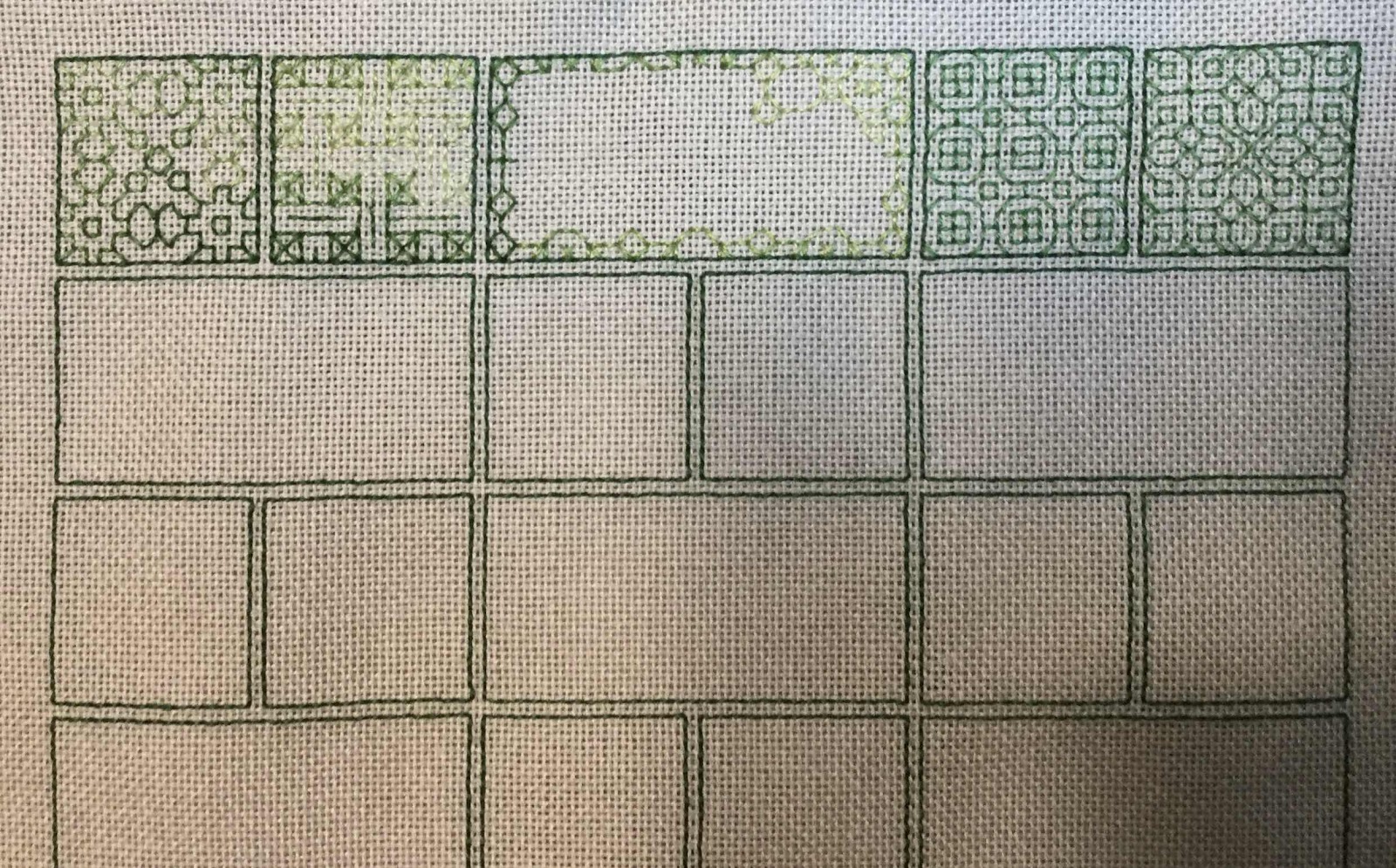 I tried a new shade of green (DMC 988) on weeks 4 & 5. I like this green much better. It is lighter than the outside of each shape, but dark enough to see the details.